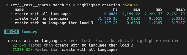 而在实际渲染时,第一个使用 highlighter 的路由渲染时间从 10s+ 降低到了不到 2s,性能差距非常明显;而后续的请求虽然不需要重新初始化 highlighter,但可能是因为使用的语言少,普遍也有约 20% 的性能提升(从这也可以看出来,代码高亮是主要的性能瓶颈)。